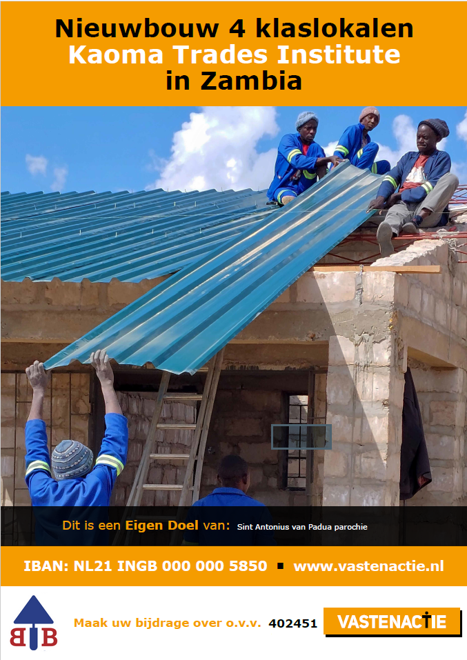 In de stad Kaoma is een school voor voortgezet en beroepsonderwijs, het KTTI, Kaoma Trades Training Institute. KTTI LogoHet aantal leerlingen is flink gegroeid, zodat er meer leslokalen nodig zijn. De Stichting Bouwen met de Bouma’s heeft de afgelopen 18 jaar meerdere bouwprojecten gefinancierd. De stichting wil bijdragen aan een betere toekomst voor de inwoners van Zambia. Daarvoor is het kunnen volgen van goed onderwijs een belangrijke voorwaarde. Het bouwen van vier extra leslokalen vergroot de capaciteit van de school van 500 studenten naar 800 studenten. Leerlingen van 12 tot 18 jaar krijgen daarmee kans op een betere toekomst.